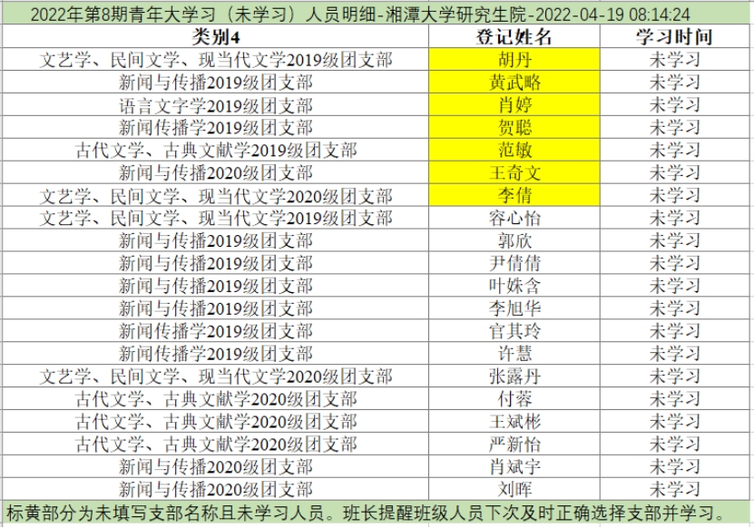 青年大学习2022年第8期学习已截止,截止时间为4月17日晚七点,现将未学习名单公布如下。请各团支部书记今后务必认真督促团支部成员,落实每周青年大学习的完成。