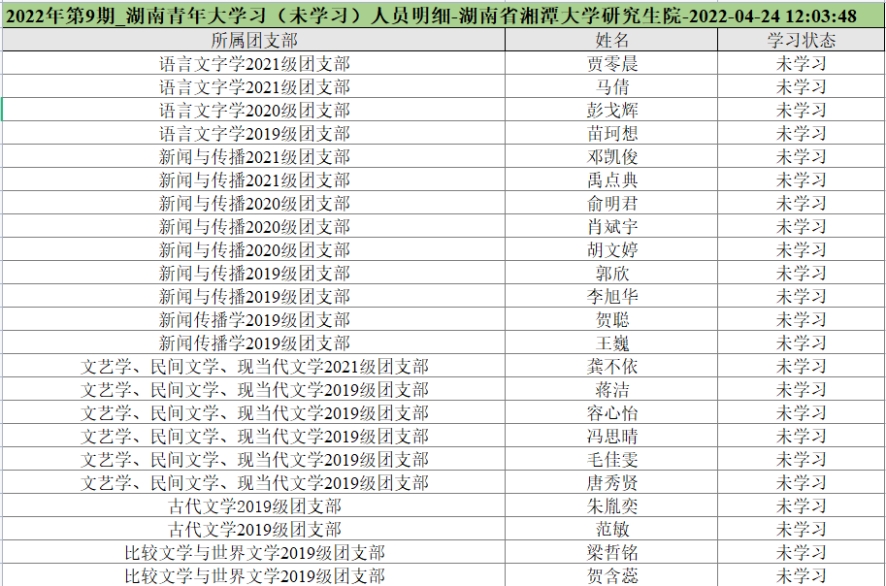 青年大学习2022年第9期学习已截止,截止时间为4月24日晚七点,现将未学习名单公布如下。请各团支部书记今后务必认真督促团支部成员,落实每周青年大学习的完成。