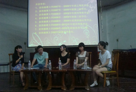 在主持人王仁灿的现场采访下,被邀请到的四位在今年研究生入学考试中取得骄人成绩的07级学长学姐与在场09级学生和党支部大一大三成员分享了他们的考研经验和学习心得。他们分别是:考研到暨南大学文艺学的中文2班的李卓、保研到51大赛