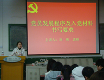 第四次授课则为公共管理学院党委刘纯副书记讲授,他从党员发展程序、入党材料书写要求两方面给同学教授了《入党程序》以及入党申请书、入党自传材料以及思想汇报的写法、要求和格式。学员还观看了影像资料,共分为“就是因为我们有理想有信念”,“一切为了理想”,“关键在于世界观”三部分,以大量的事实证明了共产主义社会道路的正确性,激励了学员学习党的知识的热情。
