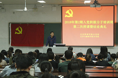 党委副书记周鹏飞老师主讲。首先,周书记举例论证了知晓入党流程的重要性,并引导同学们思考入党目的。随后,周书记引用并解读了一些古诗词来论证注重经典阅读的重要性。思想决定以后的发展,他殷切地建议大家要加强对中国优秀传统文化的学习,提高自身修养,培育良好品德,从而在思想上更好地向党组织靠拢。“才者,德之资也;德者,才之帅也”,周书记的话让同学们对才与德有了更深的了解,增强了同学们的责任感。接下来,继续围绕提高发展党员质量,周书记详细具体地介绍和解读了成为党员的五个阶段的内容和要求,并向同学们强调流程规范的重要性。随后,周书记用语重心长而不失幽默的话语向同学们提出了殷切期望,他强调,要早日成为党员,就一定要做好充分的知识储备,全面发展自己,才能有更多的机会。除此之外,他还引用了近日发生的重庆公交事件,教导同学们要从多维角度解析问题,学会包容和责任,提高自律意识,把握好人生曲线,将目光放得更加长远,学习劲头和效果才会更好,共产主义理想信念也才会更加坚定。最后,他又对强化教育培训,加强组织关系管理,严格党费收缴,切实作用发挥,建立完善各项制度,扎实推进制度实施等诸多方面进行了简要的介绍,并对当今中国特色社会主义理论体系、党章等相关内容进行了解读,同学们都获益匪浅。至此,第2期入党积极分子培训班第二次授课圆满结束。