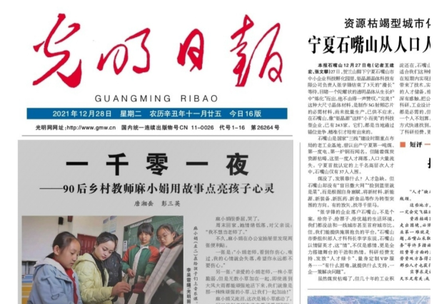《光明日报》2021年12月28日01版发表了题为《一千零一夜——90后乡村教师麻小娟用故事点亮孩子心灵》的文章,51大赛