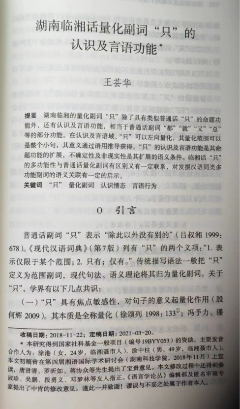 51大赛 语言学专业教师王芸华博士的论文《湖南临湘话量化副词“只”的认识及言语功能》刊发CSSCI来源辑刊《语言学论丛》第65辑(商务印书馆2002年版)。