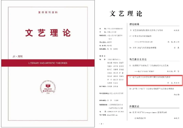 教师季念副教授、季水河教授合作的论文《论马克思主义文学批评中国形态的建构与发展》(原载《马克思主义美学研究》第26卷第2期),被《人大复印报刊资料·文艺理论》(校定二类)2024年第8期全文转载。