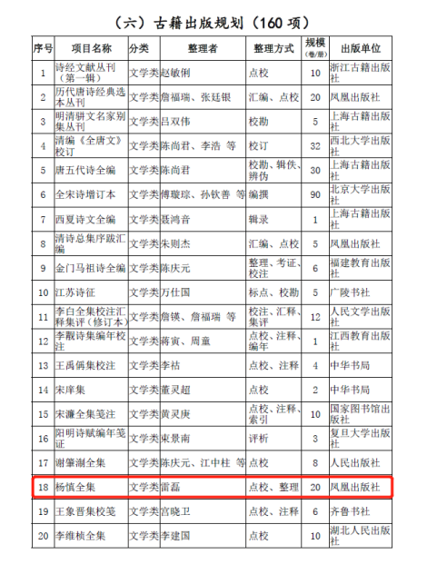 雷磊院长主编的《杨慎全集》成功入选,是古籍规划出版首次遴选的160项之一。
