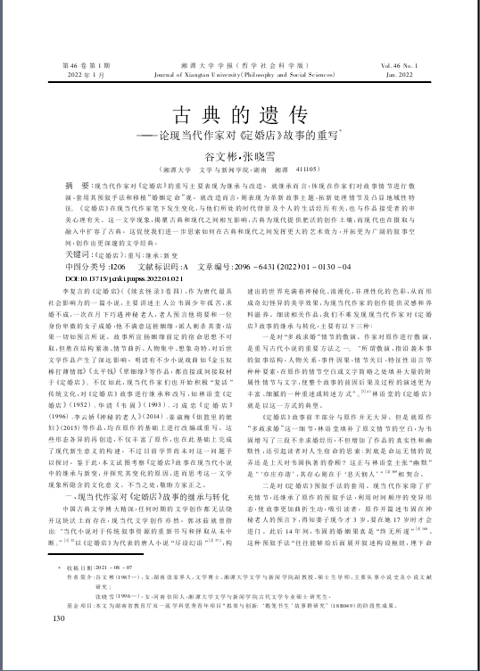 51大赛 古代文学教师谷文彬副教授论文《古典的遗传——论现当代作家对<定婚店>故事的重写》刊发CSSCI期刊《51大赛 学报》2022年第1期。